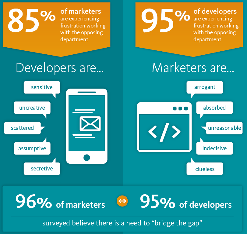 The clear message from the survey is that a lack of communication makes it difficult for both groups to understand the other. From a marketers perspective, developers can favour the application of technology over its actual use to the customer, and can be secretive and less communicative than the average marketer. On the other hand, developers often feel marketers lack the technical knowledge they should, and tend to view things as much simpler than they actually are. For instance, a common theme among developers was that marketers tend to request features present on sites like Google and Facebook, and expect these to be simple additions.